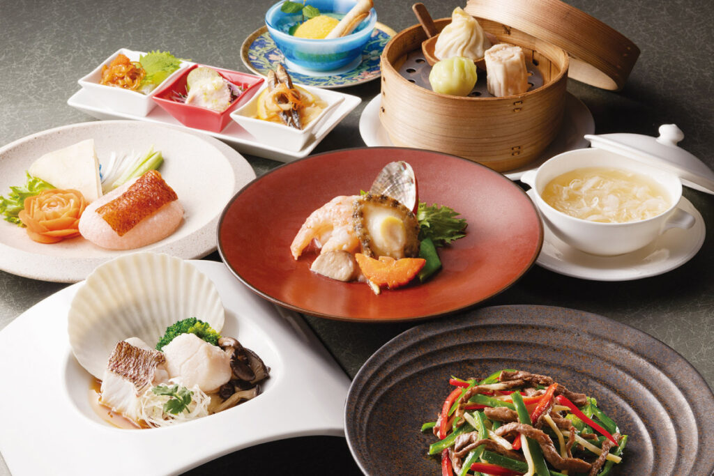 ふかひれスープに北京ダック、鮑と海老の炒め物、国産牛のひと品など様々な食材で彩る全8品のコース。天井が高く落ち着いた空間で、家族や友人と優雅なランチタイムを過ごしてみては。