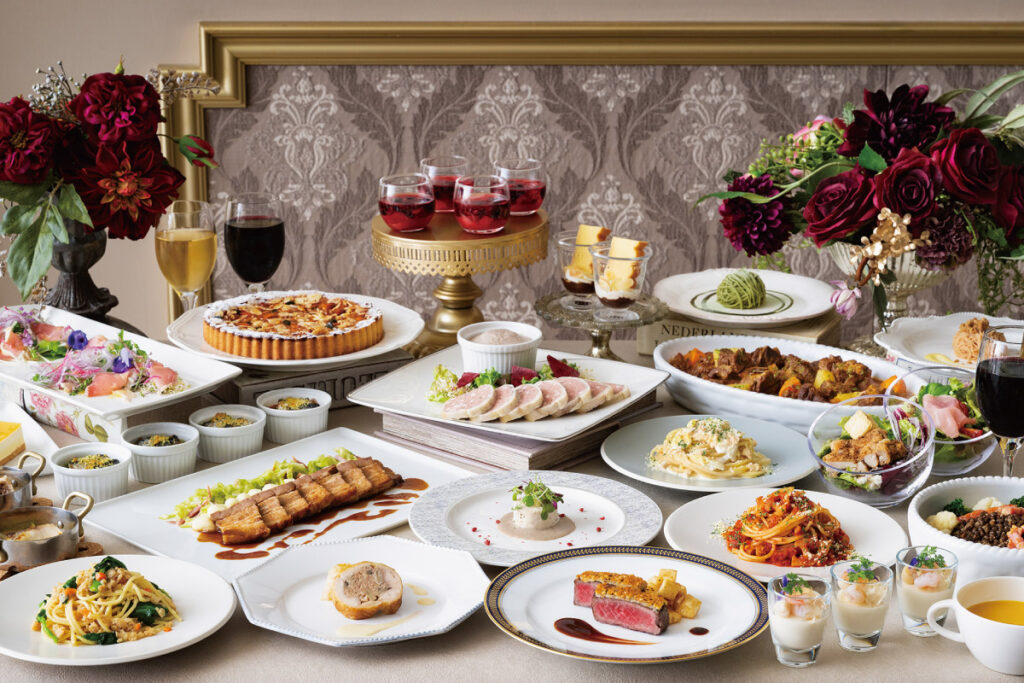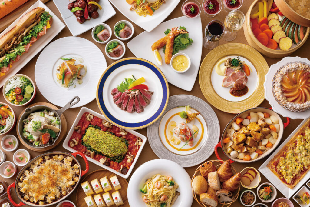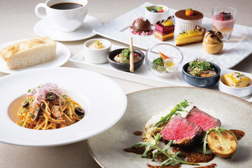 全6品から選べるメイン料理と約40種類の食べ放題メニューを組み合わせたハーフビュッフェスタイル。ディナーではハーゲンダッツアイスクリームの食べ放題やテーブルオーダー制メニューも楽しめる。