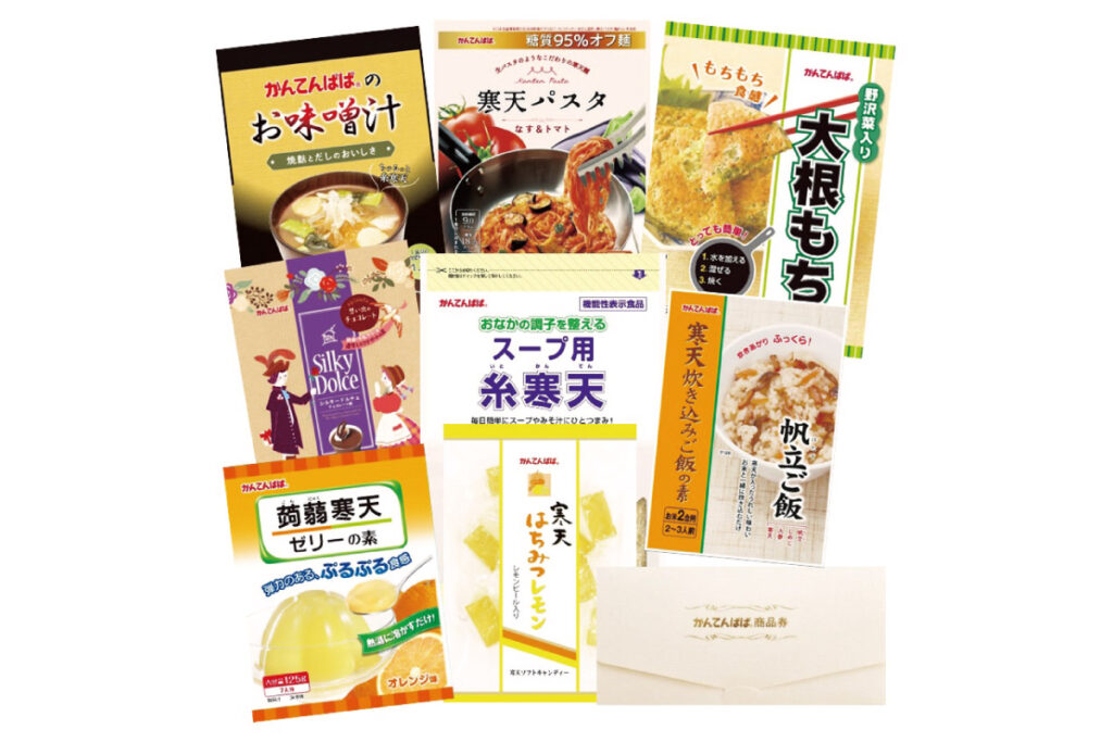 生パスタ食感の寒天パスタや簡単に作れるデザートの素といった「健康」と「ちょっと手づくり」がコンセプトのかんてんぱぱ製品の詰め合わせと、1,000円分の商品券がセットに!