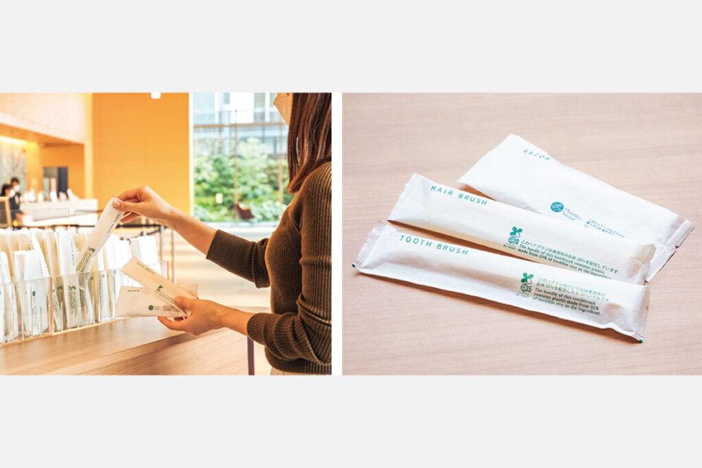 レストランやテイクアウト商品における使い捨てカトラリーやストローを、環境に配慮した素材品に切り替えてきた、阪急阪神ホテルズ。今年4月からは直営の18ホテルで、使い捨てアメニティーグッズのアイテム数を絞ると共に、必要なお客様にのみフロントロビーで提供する方式に変更。また順次、環境配慮型商品に切り替え、さらなるプラスチックごみの削減を推進している。