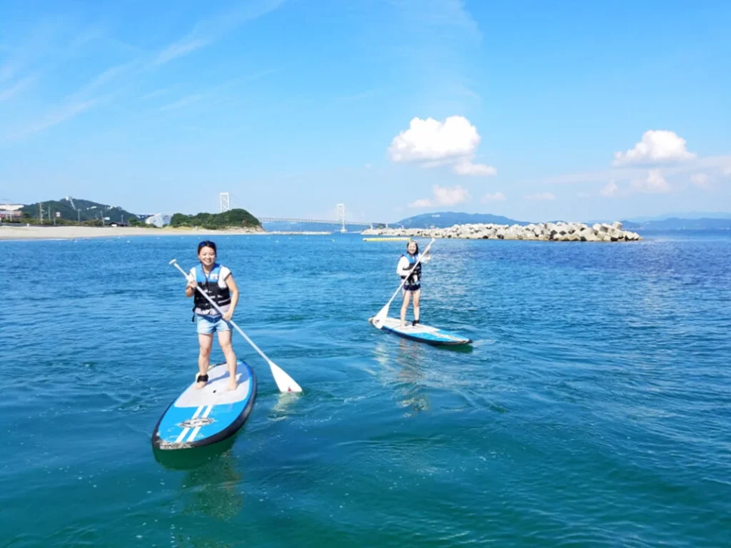 日中を満喫できるマリンメニューでは、ドラゴンボート・シーカヤック・パドルサーフィン・バードゴルフ・鳴門鯛の釣り堀から、一つを選べます。さらに、海の絶景が望めるカフェでは、ウエルカムドリンクがフリーで楽しめます。