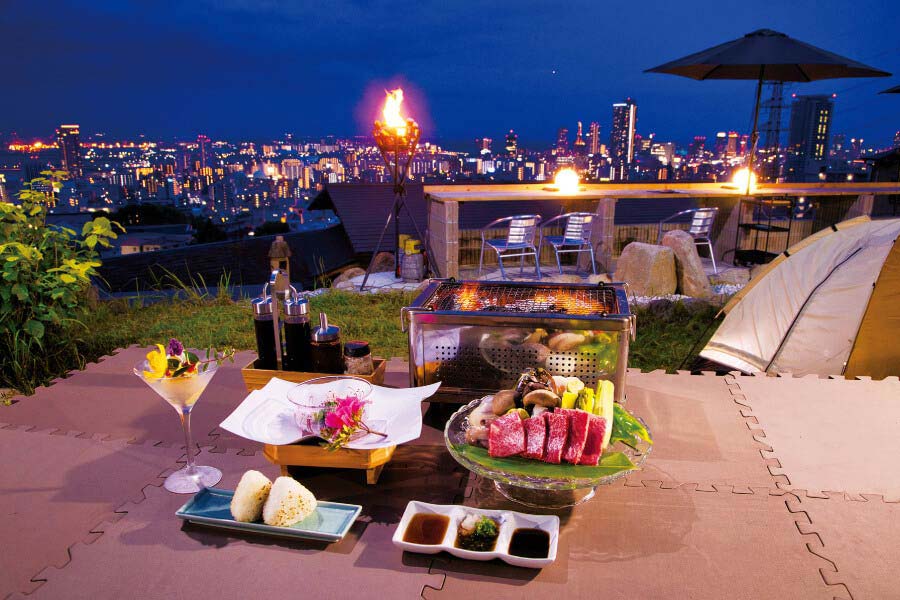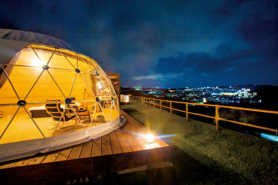 神戸・箕谷に2020年に誕生したグランピング施設。キラキラの夜景はもちろん、夕日や星空など自然の織り成す風景を温泉と楽しもう。テント内は快適でアウトドア初心者も安心。