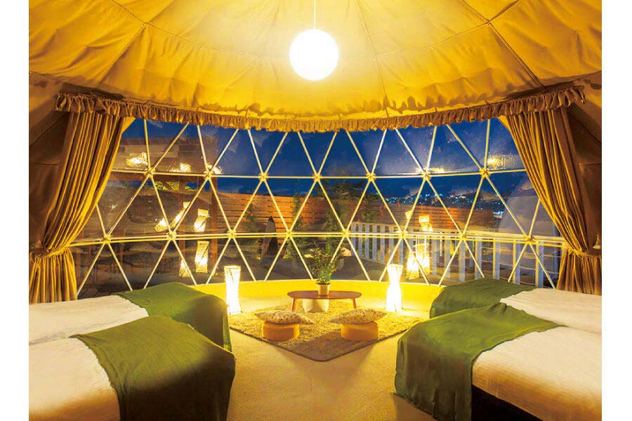 エアコン完備のドームテントは、5つの部屋タイプを用意。温泉大浴場があるほか、食事付きプランも。