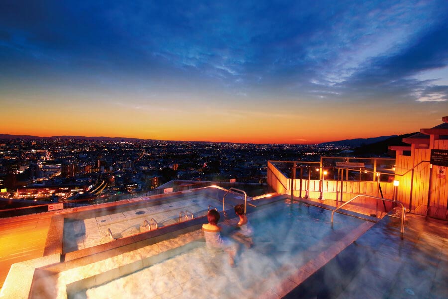 宿泊者のみ利用できる、標高約180mの屋上露天風呂「天空ノ棚湯」が評判。3段に並ぶ湯船から、大阪平野を一望する眺めは雄大。※男女入れ替え制(夕/女湯、深夜・朝/男湯)。