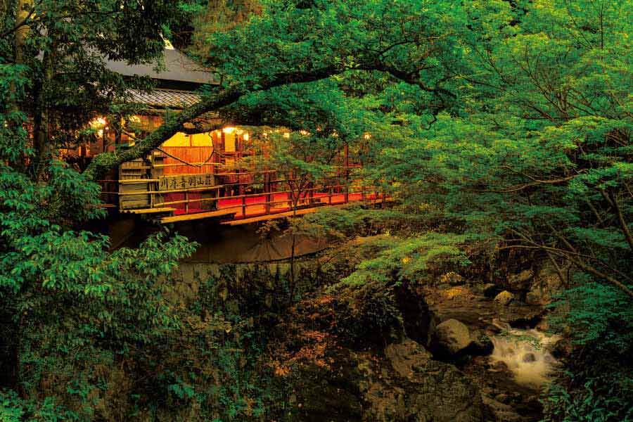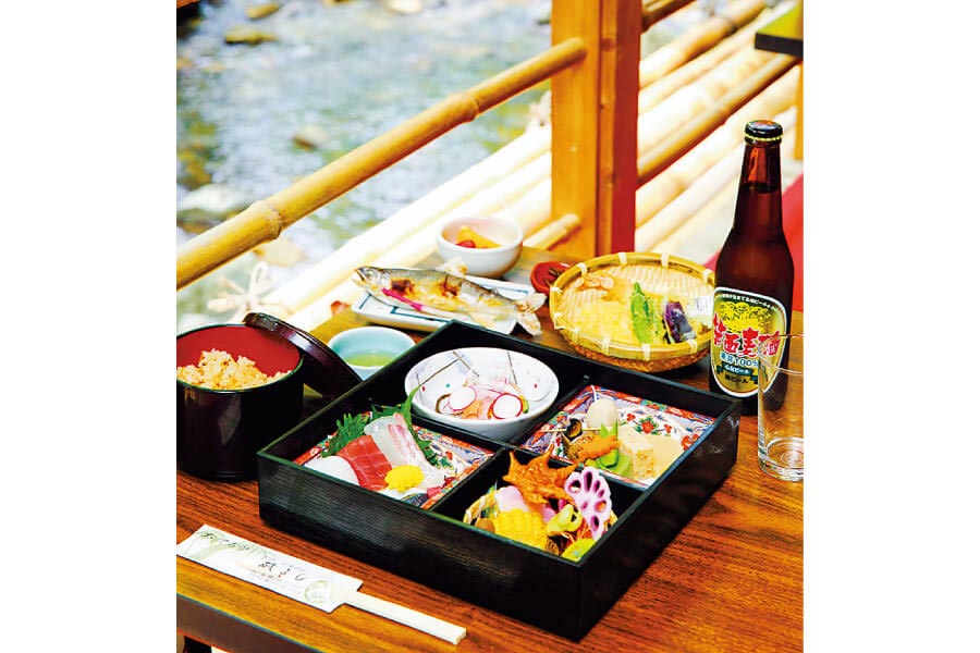 春から秋にかけて、箕面川沿いの床席で地産食材を使った和食をいただける、箕面の風物詩。料理に定評がある「音羽山荘 梅屋敷」と、広い座敷を持つ「川床 磯よし」の2軒が営業。風情ある夏季だけの夜時間を満喫しよう。