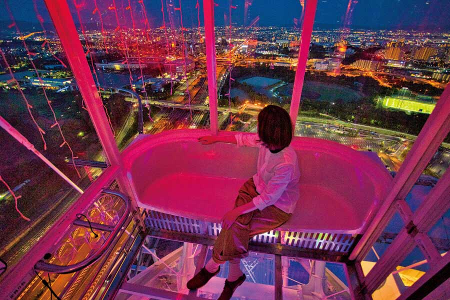 高さ約123mと日本最大の観覧車。ゴンドラは床面までシースルーで、夜空に浮いているようなドキドキ感も! 北隣に立つ太陽の塔から、遥か南の「あべのハルカス」まで約18分間、夜の大阪を見渡そう。