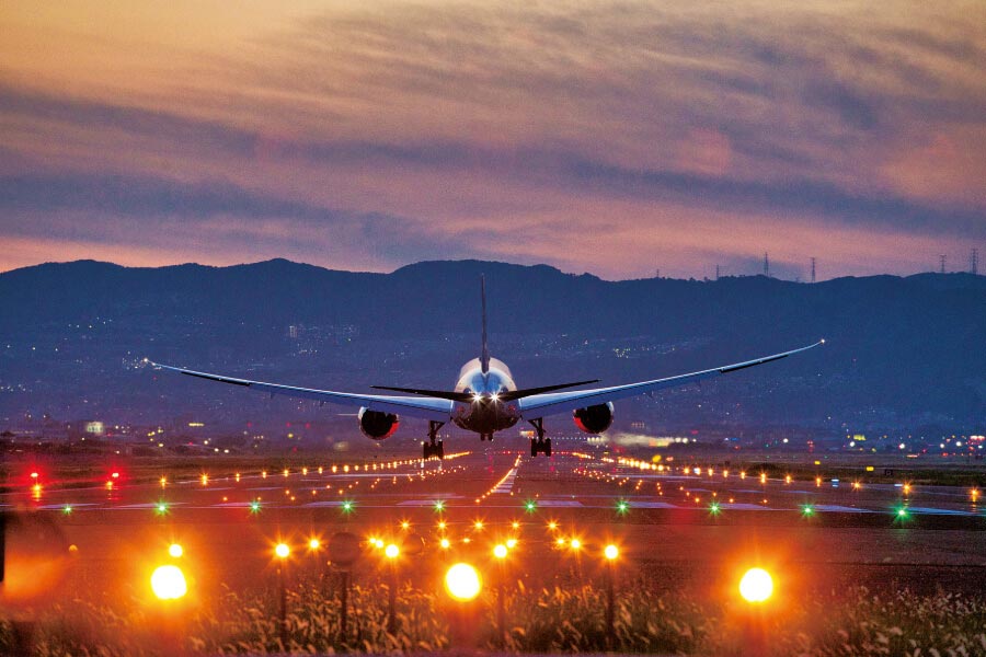 大阪国際空港に着陸する飛行機を真下から見られるスポット。手が届きそうに感じる近さを通り過ぎる姿は迫力満点! 特にトワイライトタイムの美しさは圧巻だ。空港の運用は7:00~21:00。