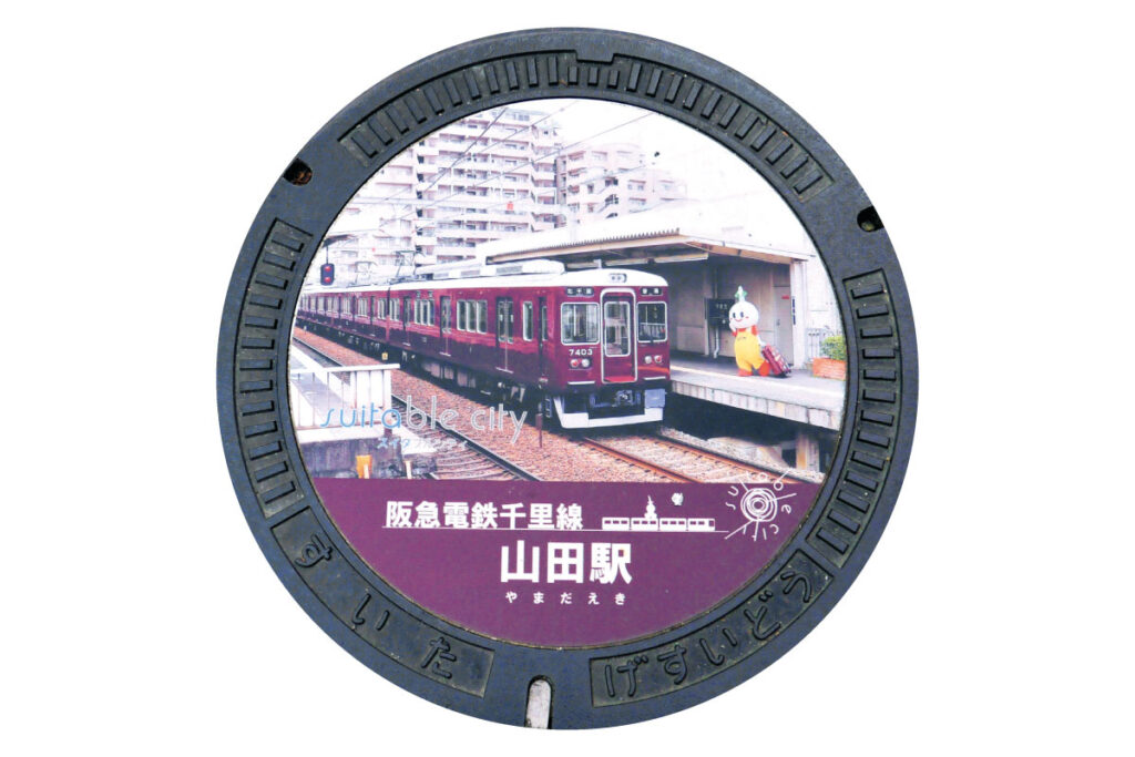 阪急電鉄をはじめ、JRや貨物など鉄道の路線が多い吹田市では、列車・駅とコラボレーションした風景写真のマンホールを市内全16駅に設置。写真は阪急電鉄・山田駅のもので、ホームに市のキャラクター・すいたんが立っている。