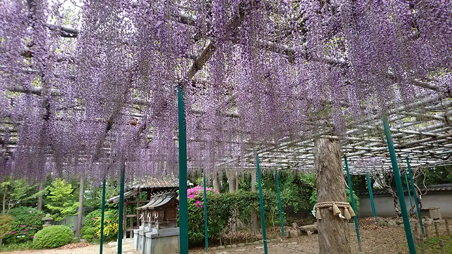 本堂のそばに、樹齢300年ほどの5本の藤の古木「後光藤」があり、春になると約45メートルにわたって紫紺の花を広げます。房の長さは1メートル以上。優雅な姿が青空に映えます。