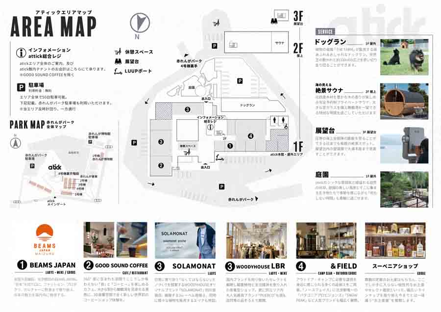 舞鶴湾を一望できる場所に、ファッション、カフェ、アウトドア、インテリアグッズ、お土産、サウナ、ドッグランなどが集結。atickは舞鶴赤れんがパークに隣接、舞鶴市役所や海上自衛隊などが建ち並ぶ舞鶴のメインエリアに位置し、秋の味覚などを楽しみに舞鶴方面へお出かけの際にはぜひ足を運んでみて。