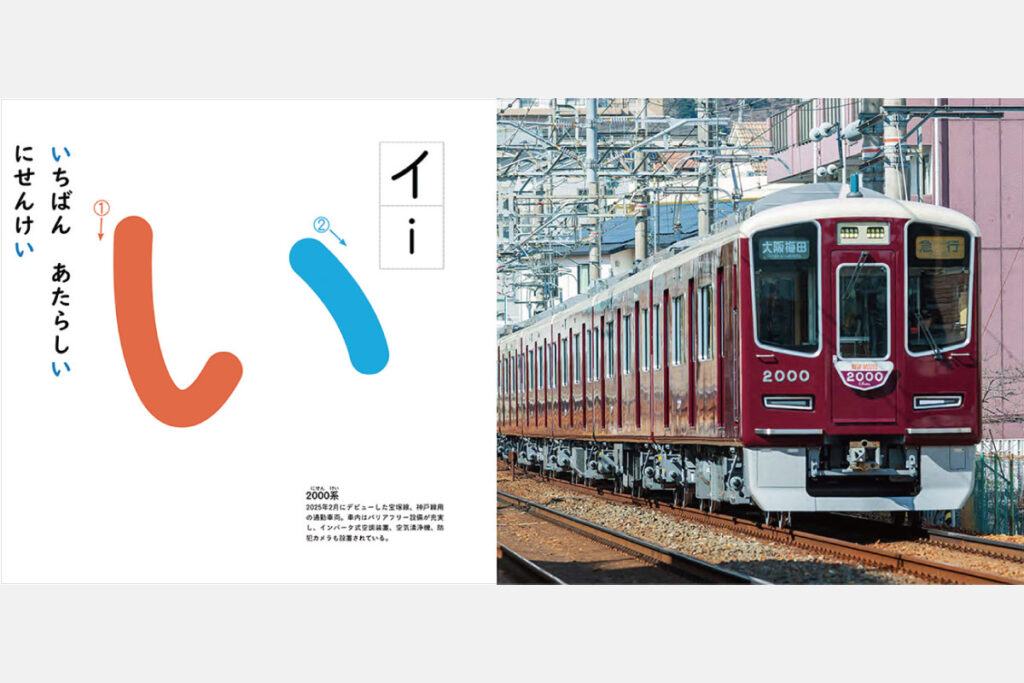 「あ」から「ん」までの五十音、一つの文字につき、阪急電車にまつわる写真や図を1点以上掲載。大きな文字が画数ごとに色分けされていて、指でなぞりながら正しい書き順を覚えることができる。カバーの裏はあいうえお表になっており、取り外して壁などに貼って使うことも可能。阪急電車の豆知識やプチ解説付きで、大人も一緒に楽しみながら学べる。