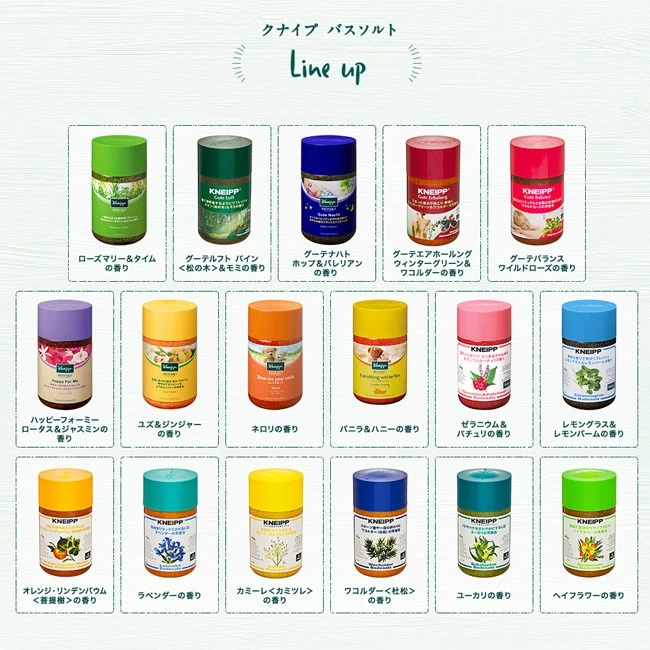 バスソルトと言えば、ドイツシェアNo.1のクナイプバスソルトです。世界でも、日本でも大人気です。クナイプバスソルトの人気の秘密は、こだわりの天然岩塩とエッセンシャルオイルです。