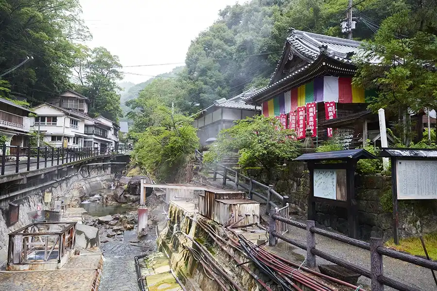 湯の谷川の谷あいに湯けむりが立ちのぼる、「湯の峰温泉」。熊野詣の湯垢離場として、かつての旅人たちはここで聖地への禊ぎを行い、道中の疲れを癒してきたといわれています。
