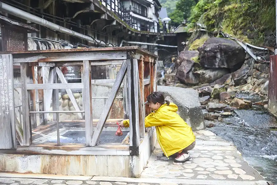 温泉街の一角には、「湯筒(ゆづつ)」と呼ばれる約90度の源泉も。ゴポゴポと湧き出る湯で、卵や野菜を茹でる体験が楽しめます。