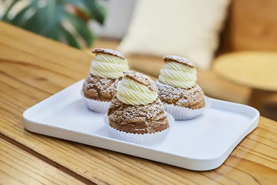 熊野古道沿いに佇む洋菓子カフェ「choux(シュー)」。看板商品のシュークリームは、ざくっと香ばしい生地に、濃厚なクリームがたっぷり。口いっぱいに広がる幸せな味わいに、一度食べると虜になる人が続出です。