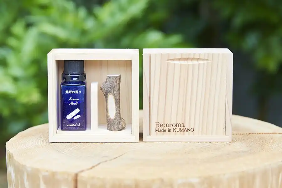 オイルを垂らして香りを楽しむための木片や、商品を梱包する木箱にも熊野産の木材が使われており、手に取るだけで特別な気分に。