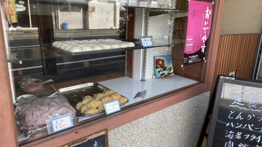 店頭に並ぶ、小餅80円、いなり寿司130円、赤飯100g200円。手書きのプレートがまた落ち着く。都会やショッピングモールではなかなか見られなくなった懐かしい雰囲気。