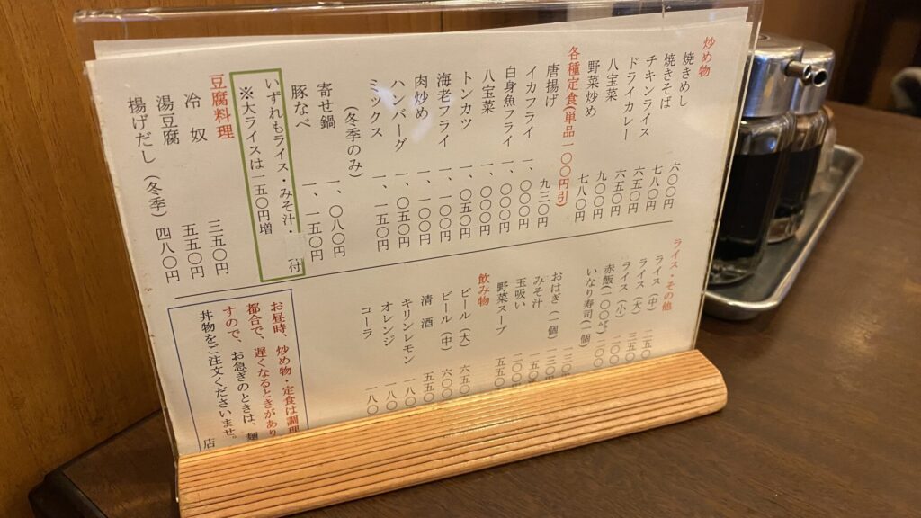 うどん・そば、丼もの、フライの定食、焼き飯、焼きそば、ドライカレー、八宝菜や、冬季限定で寄せ鍋などの鍋定食。うどんだけでも20種類程あるのに、食べてみたいものが多くあり決めるのにかなり迷いました。