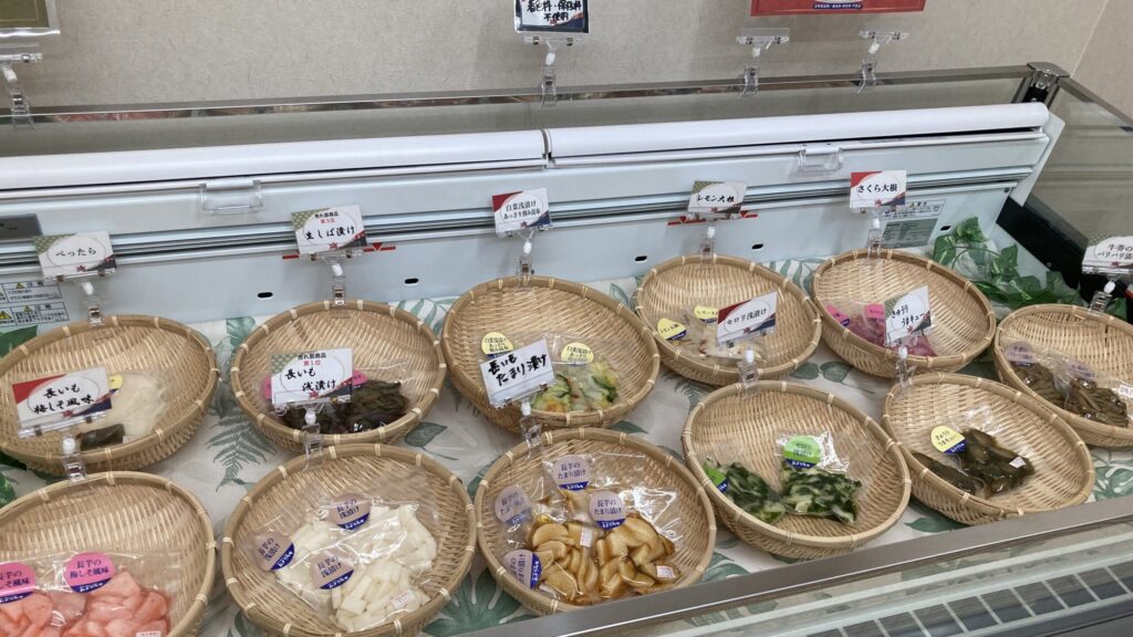定番の人気漬物は、生しば漬け、長芋たまり漬け、ごぼうのバリバリ漬け