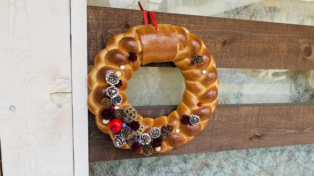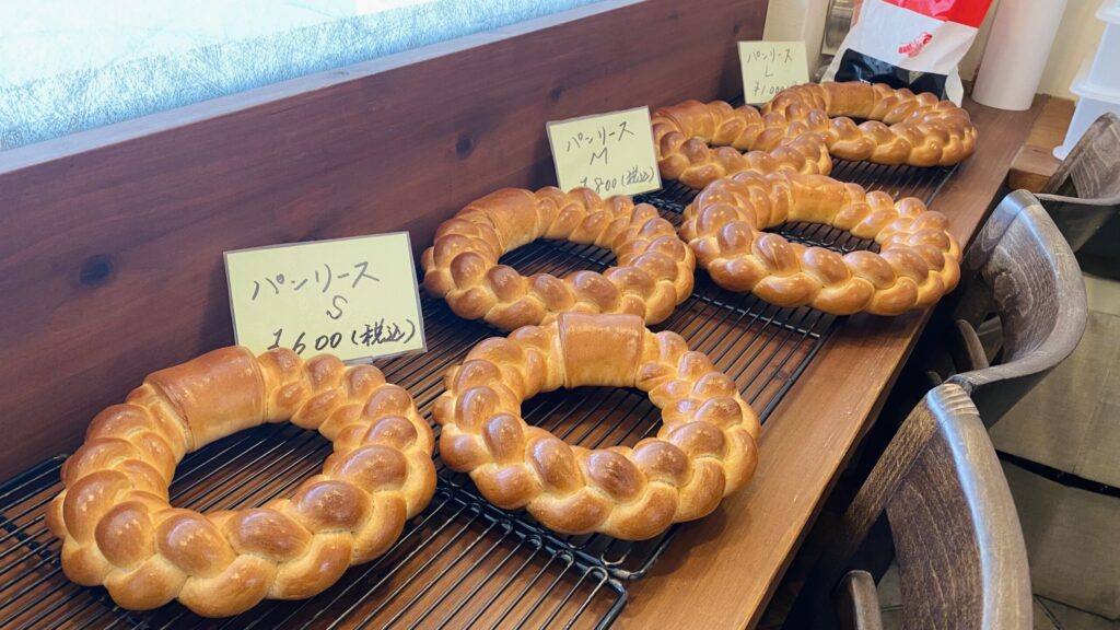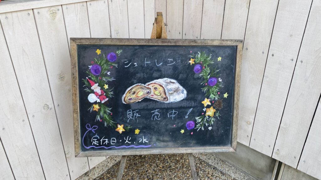 鹿王院の近くにあり、地域の人に親しまれている「パン処 太陽」。白を基調とした可愛い雰囲気のお店は、取材時ちょうどクリスマス前で、パンリースが飾られ、シュトーレン販売のお知らせもあり季節感が感じられました。パンリースを見るのは初めてでしたが、その可愛さに惹かれて一つ購入。材料は塩・小麦・バター・砂糖・イーストとパンと同じですが、硬さを出すため塩を多めに使っているそうです。手に取るとしっかりと重みがあり、基本的には食べずに飾って楽しむアイテム。屋外ではひび割れやすいものの、室内なら一年以上持つと教えていただきました。