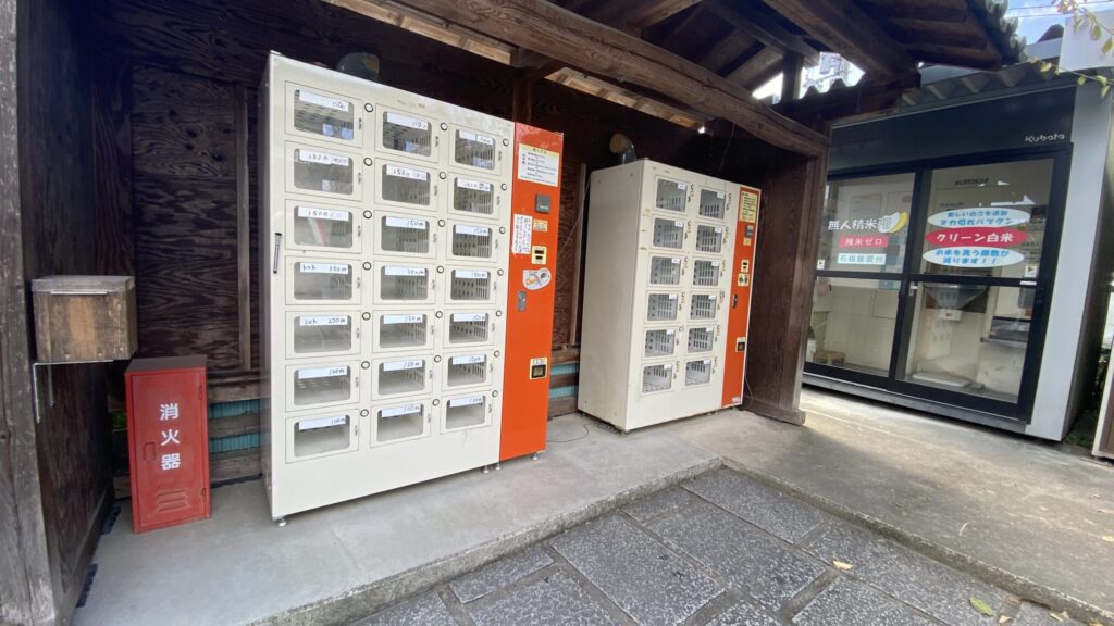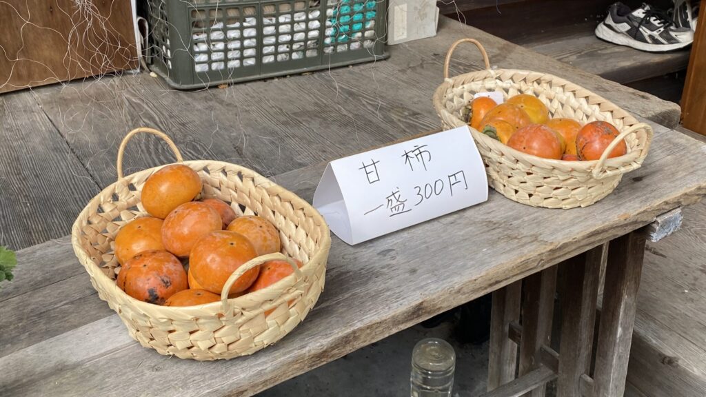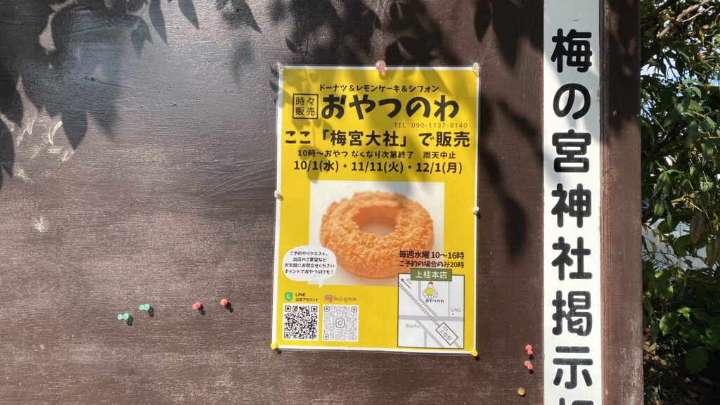 境内には収穫したての柿が並ぶ籠や、近くには野菜の自動販売機、精米所もありました。また、掲示板には「時々販売」のドーナツの案内もあり、次回はぜひ試してみたいと思います。歴史と自然、猫とのふれあいを楽しめる、ほっこりした神社体験でした。