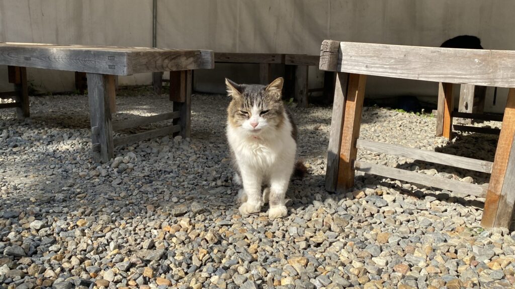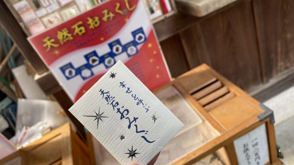 この日、境内で4匹の猫に出会いました。白猫に導かれるように進むと、「幸せを呼ぶ天然石おみくじ」の場所へ到着。引いたおみくじは「末吉」でしたが、入っていた瑪瑙(めのう)の石は商売繁盛・健康運上昇の効果があるとのことで、お守り代わりに持ち歩いています。猫たちは人慣れしていて自由気ままに過ごしており、その様子に癒されました。