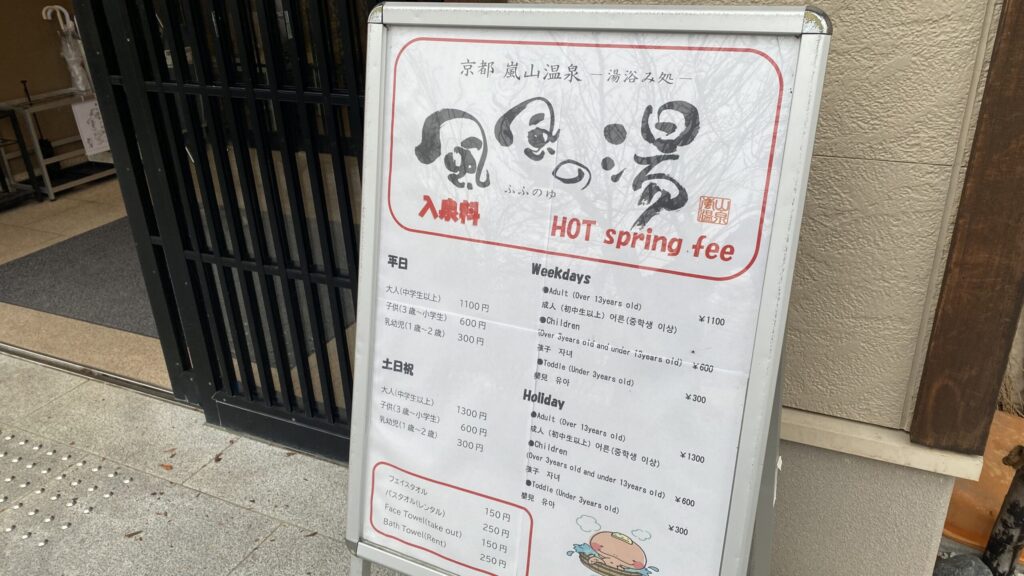 阪急嵐山駅から徒歩2分の「風風の湯」は、嵐山で唯一の日帰り温泉で、散策の途中でもふらっと立ち寄れる気軽さが魅力です。現在は平日1,100円・土日祝1,300円ですが、2026年1月1日からは平日1,200円・土日祝1,400円へ改定予定。今のうちに利用するとお得です。公式サイトには前売り券の割引があり、シルバーDAY(60歳以上600円)や学生DAY(900円)、アイス割引DAYなど、楽しいイベントもあります。