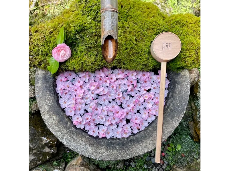 花の寺とも呼ばれる古刹・勝持寺は西山連峯の麓(ふもと)にあって、桜をこよなく愛した平安時代の歌人・西行が植えたとされる西行桜が今も受け継がれています。頭上高くから降り注ぐように落ちてくる花と枝に思わず目を奪われます。