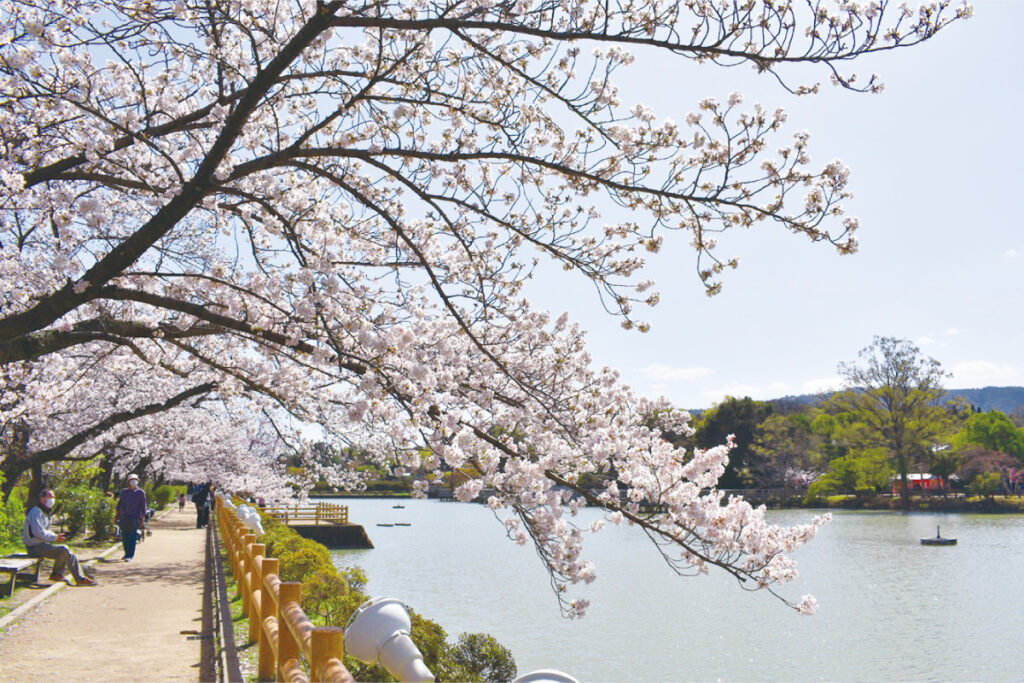 日本最古の人工庭池「大沢池」の周辺に桜が植えられ、約1キロメートルの散歩が楽しめる。水鏡に移る姿も雅。