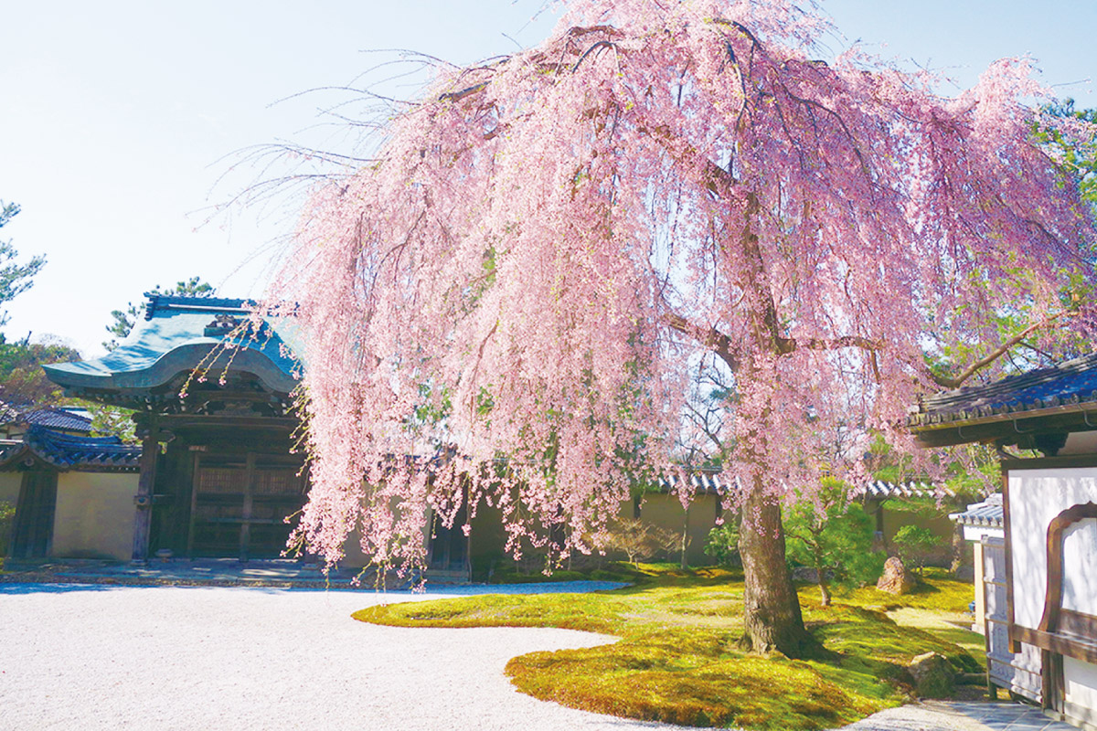 方丈前庭・波心庭の白砂にかかる枝垂れ桜は見事の一言に尽きます。枝の落ち方まで計算されたかのように感じるほど、手入れの技が光る一木特別拝観期間には、方丈前庭の設えとシダレザクラの競演を鑑賞できます。