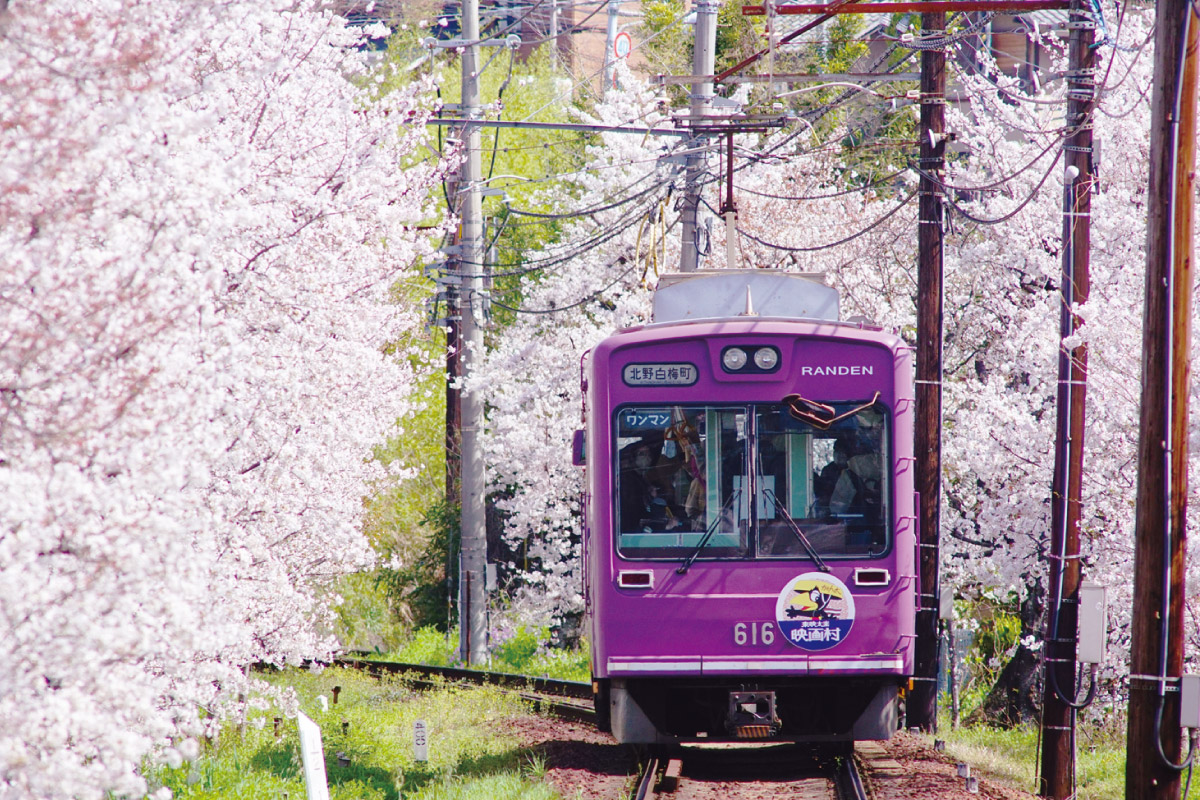 嵐電北野線の鳴滝〜宇多野駅間に現れる桜のトンネル。約200メートルに渡ってソメイヨシノが線路の左右に立ち並びます。桜をかき分けるようにして走るレトロな車両も可愛い。