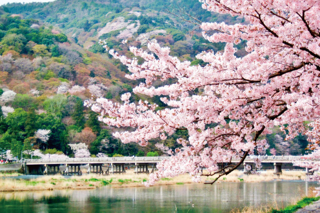 あふれんばかりに咲く桜越しの「渡月橋」と、その向こうに望む嵐山は絵巻物のような美しさ。