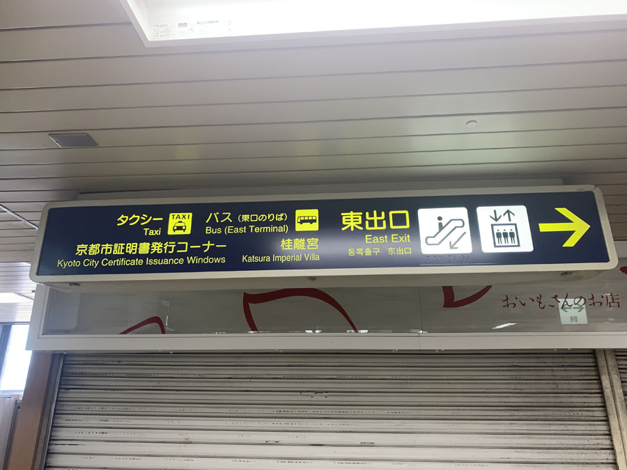 駅の改札を出たら、東出口へ向かいましょう。写真のような案内が天井からさがっています。桂離宮の表記もきちんと出ていますので、案内板通りに進んでください。