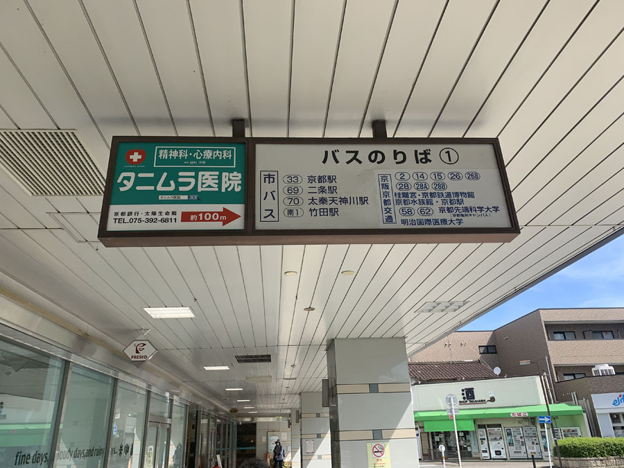 バスの本数は市バス、京阪バスいずれも1時間に3本ずつです。10分間隔でバスがやってきます。