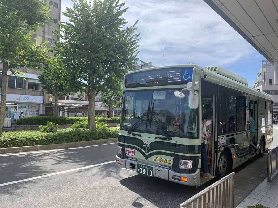 バスのりば①から桂離宮へ向かうには緑色の京都市バス、赤色の京阪バス、いずれも「京都駅方面行き」に乗車します。