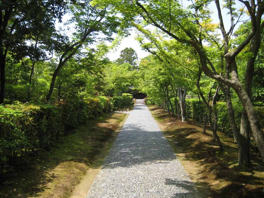 桂離宮への内部へといざなう、いわばエントランスのような御幸道。両側の生垣が直線的に延び、その先で少し斜めにひねった土橋が架けてあります。そうすることで、奥行きが深く見えるよう工夫されているようです。