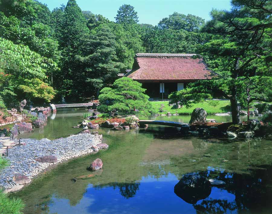 桂離宮の中心的な御殿です。古書院、中書院、新御殿がななめに並んで建てられ、古書院の前には月見台が造られています。空と庭園、書院を含む遠景も楽しみたいポイントです。