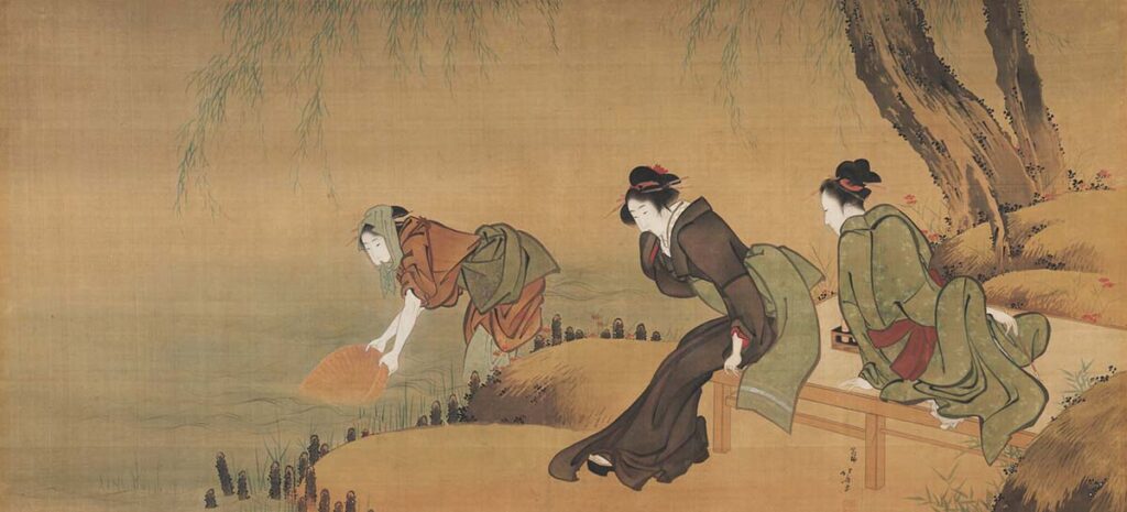 歌川広重や葛飾北斎など、江戸で活躍した著名な浮世絵師によって描かれたものから、近世に京都や大阪で活躍した画家によるものまでさまざまな作品を展示。作品に描かれた女性の髪形や衣服に目をこらすと、当時流行した風俗を知ることができる。