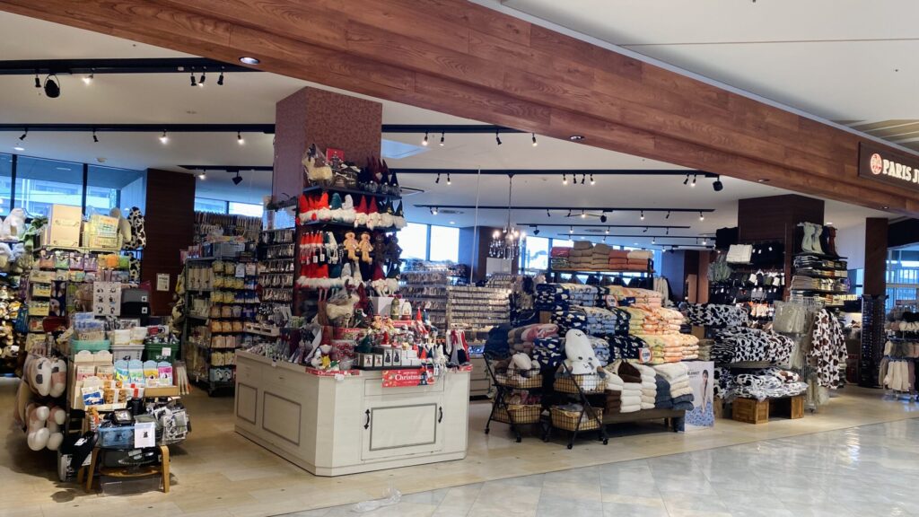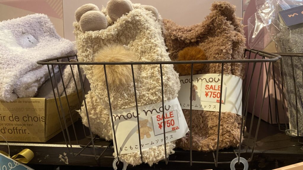 店頭には暖かそうな冬グッズがずらり。ふわふわのブランケットやモコモコガウン、マフラーや手袋、クリスマス限定の可愛い装飾品まで揃っています。