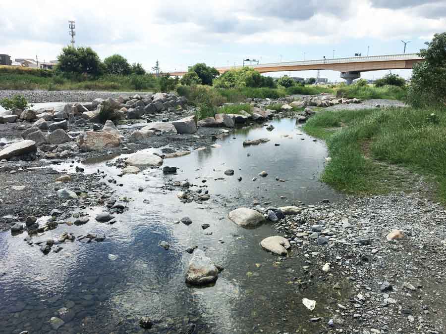 春から初秋になると、バーベキューを楽しむ家族やグループが訪れる、猪名川沿いの河原。河原の片隅に水遊びができるコーナーがあります。