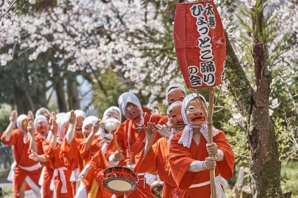 僧侶らよる法螺貝の音色が会場に響き渡る中、参加型お神輿パレードが出発。客も一緒にオリジナル法被を着て、太秦の新名物「ひょっとこ踊り」と村内を練り歩きながら楽しく踊ります。