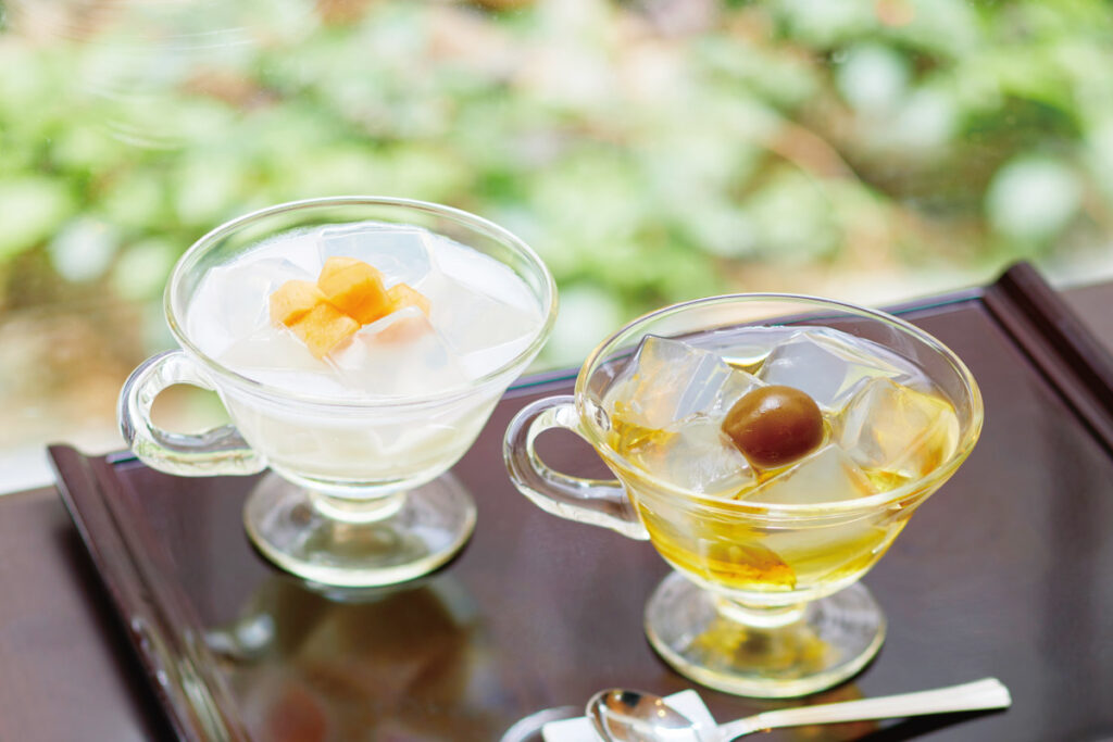 京都らしく奥に深い間取りを生かして設けられた甘味処。坪庭を見ながら、さっぱりと暑さを払ってくれる美しいスイーツを堪能して。