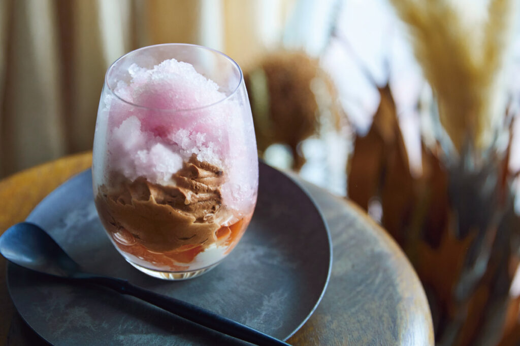 そして、毎月のパルフェでも同店の世界観を存分に味わうことができる。6月は「茗荷とショコラのパルフェ」が登場。グラスの底から「糀(こうじ)屋雨風さんの麴甘酒のブラマンジェ」、「グレープフルーツとソーテルワインのジュレ」、「高知四万十産・生姜(しょうが)のムースムラングショコラ」、「高知県須崎産・茗荷のグラニテ」、そしてお好みで和歌山県のクラフトジン「槙-KOZUE-」をかけていただく。茗荷のグラニテにジンをかけると一層、茗荷の味わいが引き立ち、さっぱりとした口当たりも際立つ。