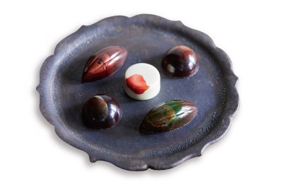 JHOICE laboratoryの定番5種のガナッシュ。右上から時計回りにぶどう山椒、黒にんにく×苺、六甲味噌、醤油×黒糖×生姜、赤酒×生姜×シナモン。