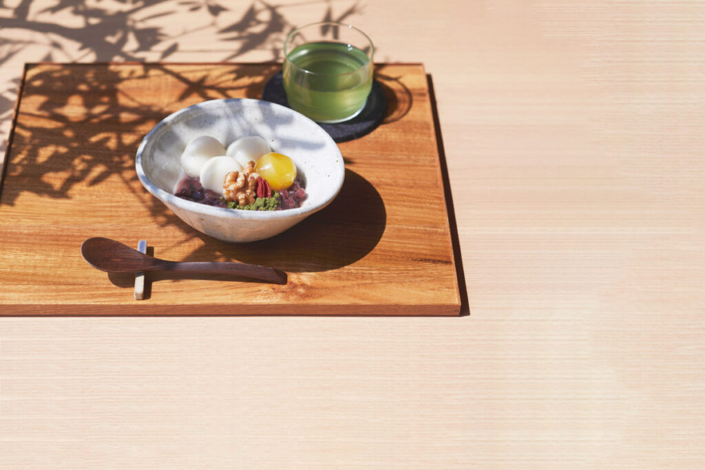 種から育てた茶樹から採れた茶なども扱う茶と菓子の専門店。自家製の餡に白玉、和栗、くるみなどが入った冷たいぜんざいは、それぞれの個性をそのまま味わえる一品。やさしい甘味が特徴の煎茶とセットでどうぞ。
