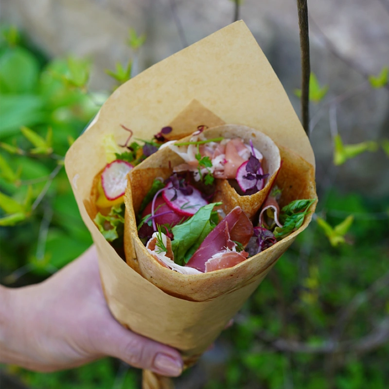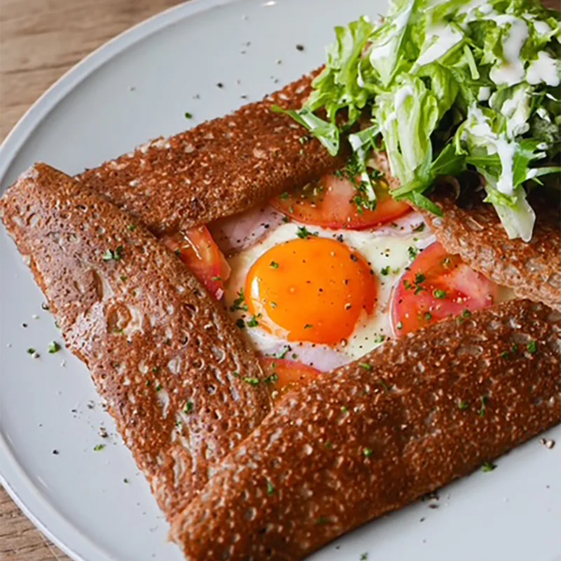 そば粉を使ったフランス・ブルターニュ地方発祥の郷土料理「ガレット」を専門とし、京都御所南に店を構える「ヌフクレープリー」。自家製ハム、卵、チーズを使ったベーシックなガレットのほか、もちもち食感のデザートクレープもイートインで楽しめます。