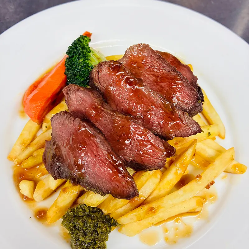 岐阜県で鹿の捕獲から精肉加工、販売までを一貫して行う「シャルキュトリーレストラン 里山きさら」から、ステーキフリットを鹿肉で表現した一皿が登場。あっさりとした鹿肉に、爽やかな自家製ハーブバターとカリッと揚げたフライドポテトがよく合います。