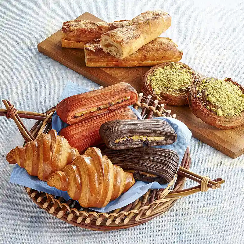 国産素材にこだわる「ブーランジェリー エス・イガラシ」と、折り込み生地に特化したパンを作る「エスタージュ」。両者を組み合わせ、国内製造した発酵バターを折り込んだクロワッサンや、クロワッサン生地にパティシェールクリームとチョコレートを挟んだパンスイスなど、バターの香りが豊かに広がるパンが豊富に揃います。