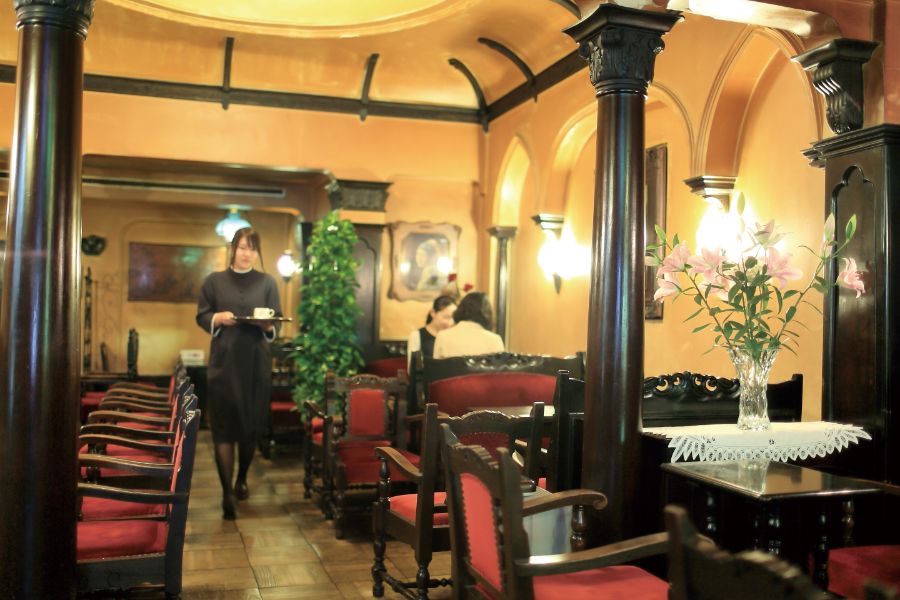 京町家の骨組みを残し、バロック様式を取り入れた内装は、豪華客船のホールをイメージしたもの。多くの文化人や芸術家にも愛された京都の文化サロン的存在。レトロスタイルの給仕姿もクラシック音楽の流れる店内にぴったり。