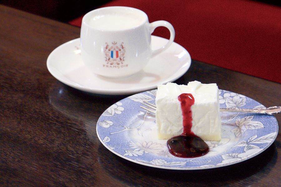 ウインナータイプのコーヒーとレアチーズケーキを一緒に楽しむのがフランソワ流。